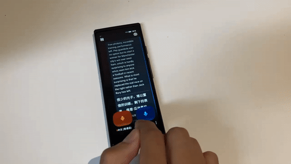 切换之后,翻译机屏幕会分成上下两个部分,点击上面录入英文进行互译,点击下方录入中文进行互译。面对面聊天时,还可以根据实际情况选择翻译机的自动或手动模式来进一步提升效率。使用面对面翻译时最好要在相对安静的环境下,这样能够达到更好的使用效果,并且保持对话的流畅性。